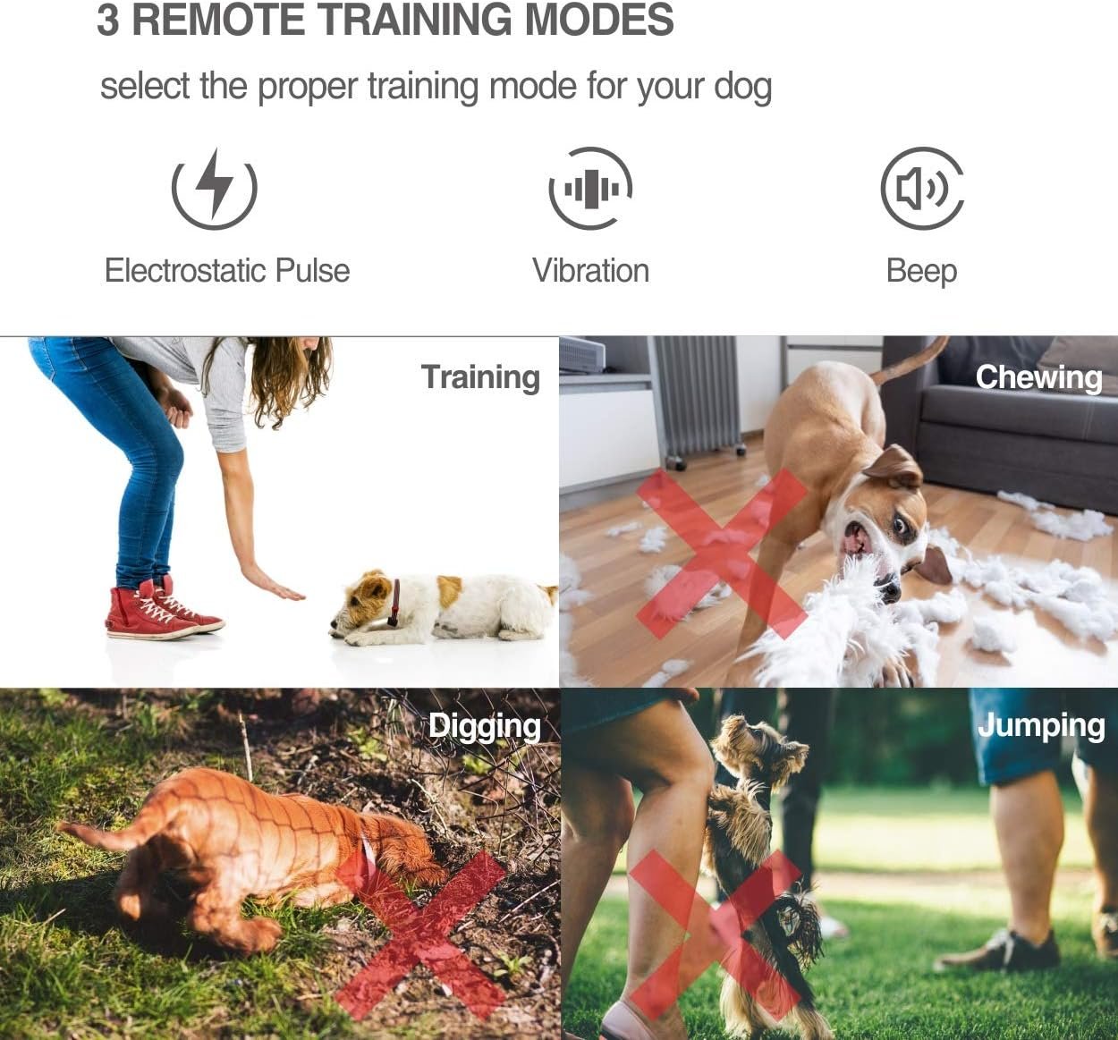 training mode teach your dog obedience basic command, the anti bark mode make your dog stop bark automatic.This affordable unit has a waterproof collar receiver and a range of 600 meters, allowing your dog to enjoy the wettest situation sat a distance of 3 football fields! With the system’s 99 levels of electrostatic plue’,vibration and standard tone, it’s ideal for reinforcing dog obedience around the house,backyard or lake.